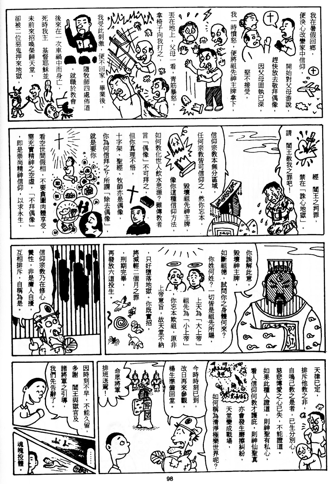 地獄遊記是一本介紹陰間地府的指南漫畫,該 漫畫於民國六十五年所著,當初仙佛為勸化世人,特將地獄奇景公諸於世,在台中聖賢堂以扶鸞的方式傳真了地獄裡生靈塗炭的一面。那時在堂中參觀扶鸞的鄉親民眾,對於仙佛能夠在大眾面前間寫下流利的詩詞章句,且能夠在沙盤中寫出恐怖的地獄景象莫不嘆為觀止!面對當今人心沉淪的社會,殺盜擄掠不斷,此 本漫畫實在是一盞醒世之名燈!正所謂平日不作虧心事,半夜不怕鬼敲門。地獄的存在,對於平日端正自我之人如同虛設!你說不是嗎?但願這個世界祥和早日降臨,是是非非能早日遠離!不拜偶像的真正意思