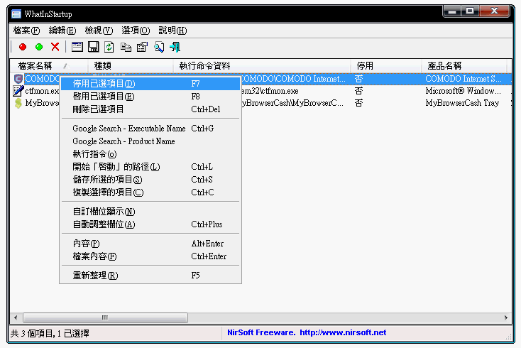 此實用程序會顯示所有在Windows啟動時自動加載的應用程序列表。對於每個應用程序,將顯示以下信息:啟動類型(註冊表/啟動文件夾),命令行字符串,產品名稱,文件版本,公司名稱,地點在註冊表或文件系統,以及更多。